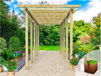 'A Beautiful Garden Feature'The Royal Walkway Pergola combines architectural elegance with functionality.A Pergola adds height and privacy to any garden and is excellent support for climbing plants. Pergolas can link pavilions or extend from a building's door to an open garden feature such as an isolated terrace or pool. The brand new Royal Walkway Freestanding Pergola provides a walkway that allows for breeze and light sun. It also offers your climbing plants a structure on which to grow.As an added bonus, we have now upgraded the Pergola using Steel Cross Rafter Fixings (supplied) for a stronger, more robust structure.The Pergola measures approximately 7.2m long and tip to tip. The scrolled rafters measure 2.4m. The walkway width is defined by moving the posts in or out slightly depending on your preference, making this Pergola very universal!Pergola Components:x6 92mm x 92mm Uprights (2.7m or 2.1m) x12 2.4m Cross Rafters (double end scrolled)x4 3.6m Length Rafters (single end scrolled)x24 Steel Cross Rafter Fixingsx6 Post Ground Fixings (where appropriate, see options)If you would like any more information on this product, please call the number at the top of this page and speak to our super efficient sales team now!